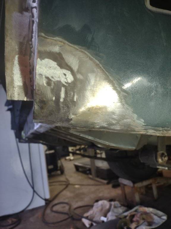 Well, I'm still at it. I've been chipping away at this anytime I get a chance to. It was nice that the mill was slow for awhile I got a lot accomplished. Working two 16 hour shifts and an 8 hour shift for the week was nice while it lasted. Anyways, I had to patch up the wheel wells, yes I smeared JB weld over the seams to seal up any pinholes. That will be cleaned up and painted. As far as the underside goes it's about 96% undercoating free. Now I'm scrubbing and degreasing before I paint it up.