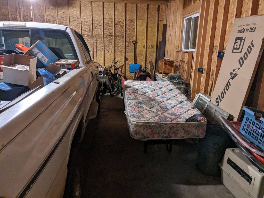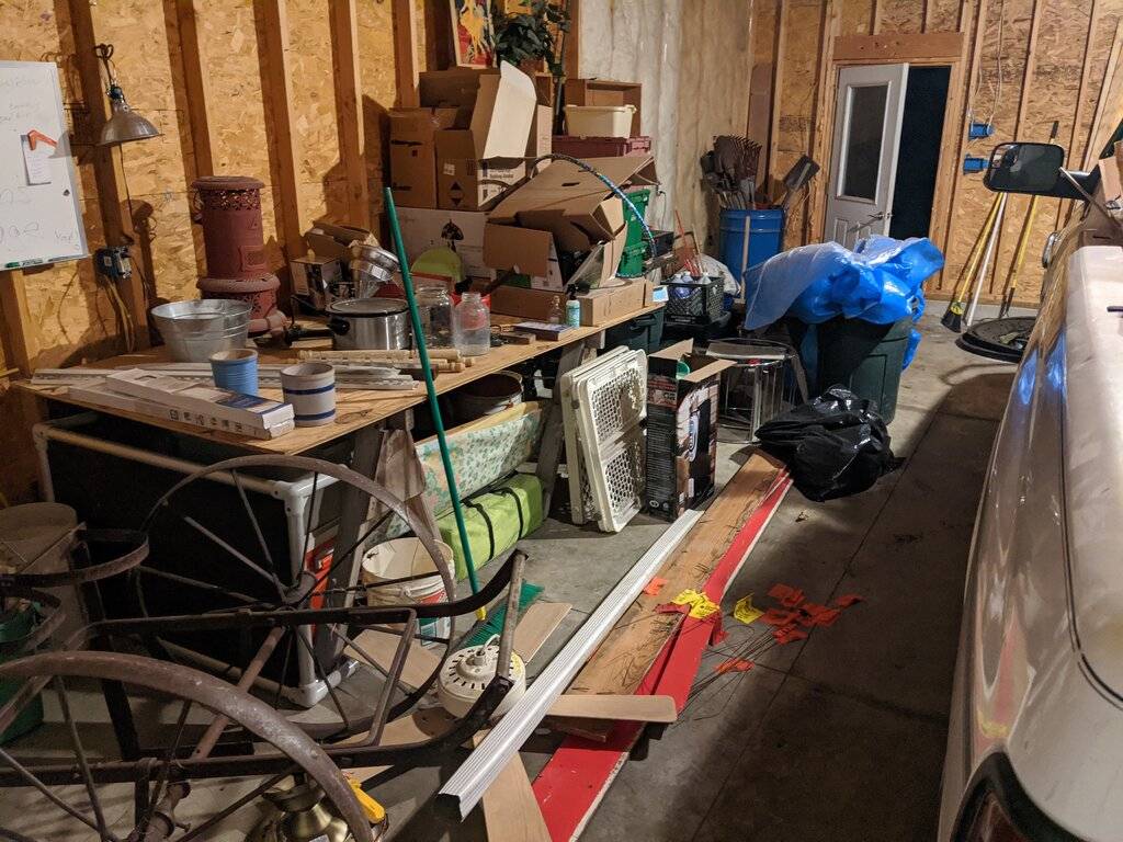 The garage is full of a bunch of crap the previous owner left. They left a ton of stuff, which my co-worker cleaned out most of. They did leave some shovels and rakes, along with some other useful things. A lot left to get rid of though.