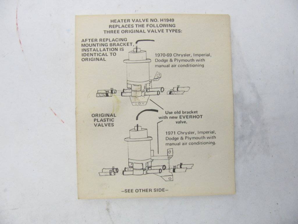 NOS, $150 (I have seen some cheaper ones, this is for illustration): NOS Mopar Heater Control Valve 1969-71 B & C Body W/ A/C - Hiltop Auto Parts
