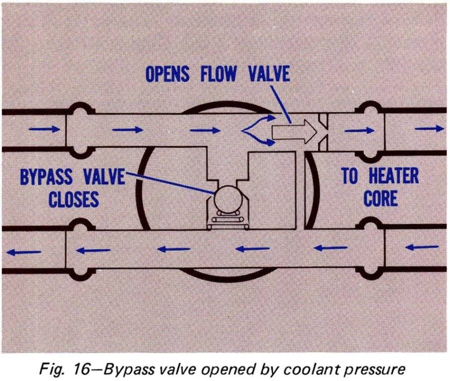 "The water valve used on these models is a combination bypass and flow valve. The flow part of the valve is fully closed by moving the temperature control lever all of the way to the left. This shuts off flow through the heater core. The bypass part of the valve is a spring-loaded poppet. When the flow valve is closed, coolant pressure opens the bypass and coolant returns to the engine without going through the heater core. The pressure-operated bypass valve automatically compensates for changes in engine speed and coolant pressure. This bypass feature results in very good coolant volume and temperature control."