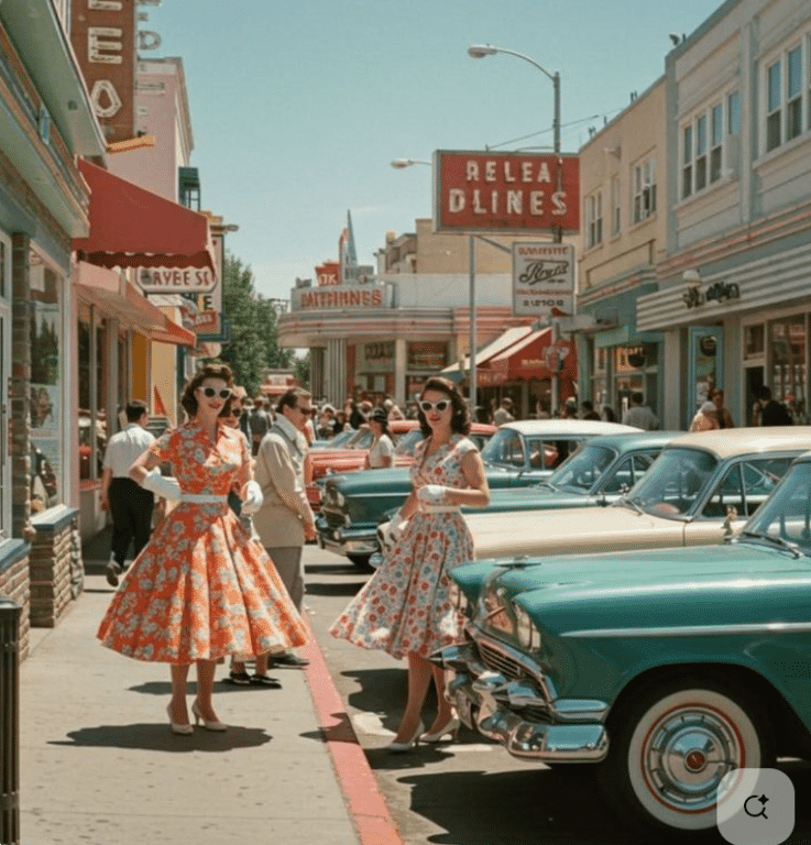 The car in the front should be a 56 Chevy, they didn't have Dagmars. Nor do they look symmetrical. I can't place the hubcaps, but they aren't GM. If they are real at all. You also have one dress moving as if there's wind blowing and the other isn't. Looks AI to me.Somewhere in the mid 50's I'd guess.