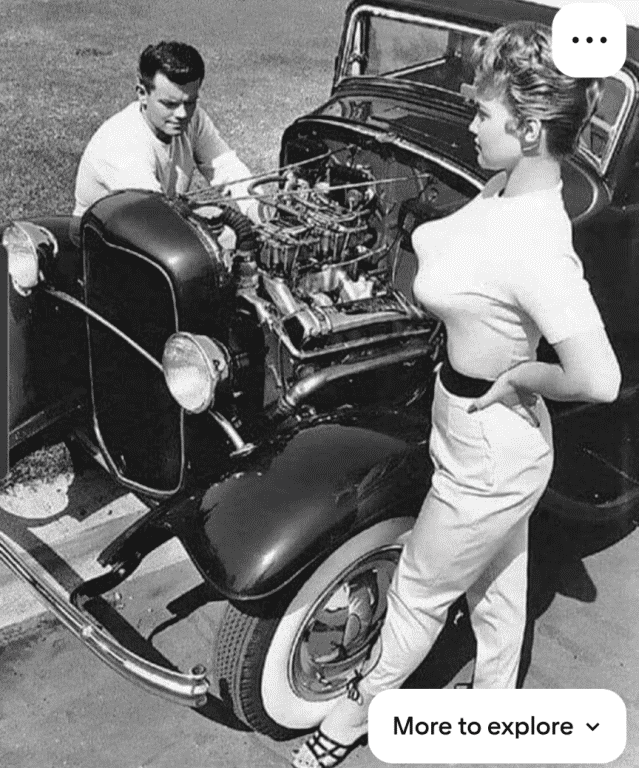 The car in the front should be a 56 Chevy, they didn't have Dagmars. Nor do they look symmetrical. I can't place the hubcaps, but they aren't GM. If they are real at all. You also have one dress moving as if there's wind blowing and the other isn't. Looks AI to me.