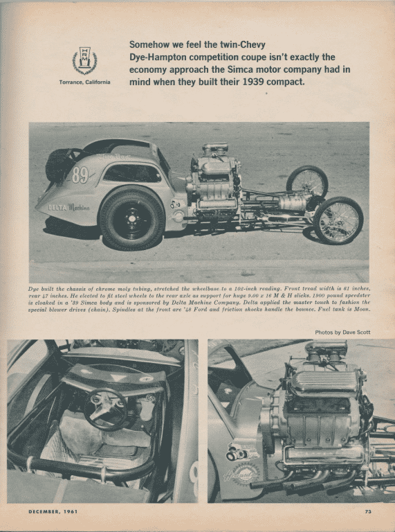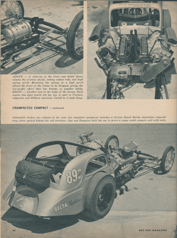 Not exactly slow now...two, 6-71 blown Chevies, said to be 550 HP each, 3.90 gears, 1,900 lbs, 8.85 ET, 172 Mph, AA/modified class.