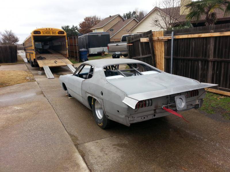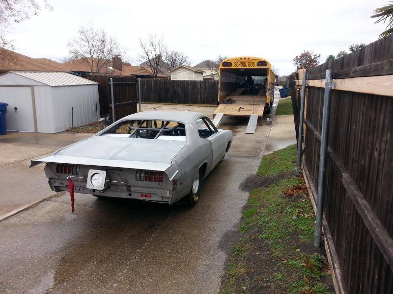 it was a bus that he found that a guy had built to haul his 10.5 outlaw car and his promod. The back of the bus lays down and you use ramps to pull/drive the car into the back of the bus. It has a ramp so the car sits on an incline in the bus. There are still about 10 rows of seat area that is a living quarters area for sitting back and sleeping. He still has quite a bit of work to do on it inside to get it finished but it really is a cool set up. He installed a winch so he can winch the car in. There is still enough room after the car is in for a 4 wheeler as well.