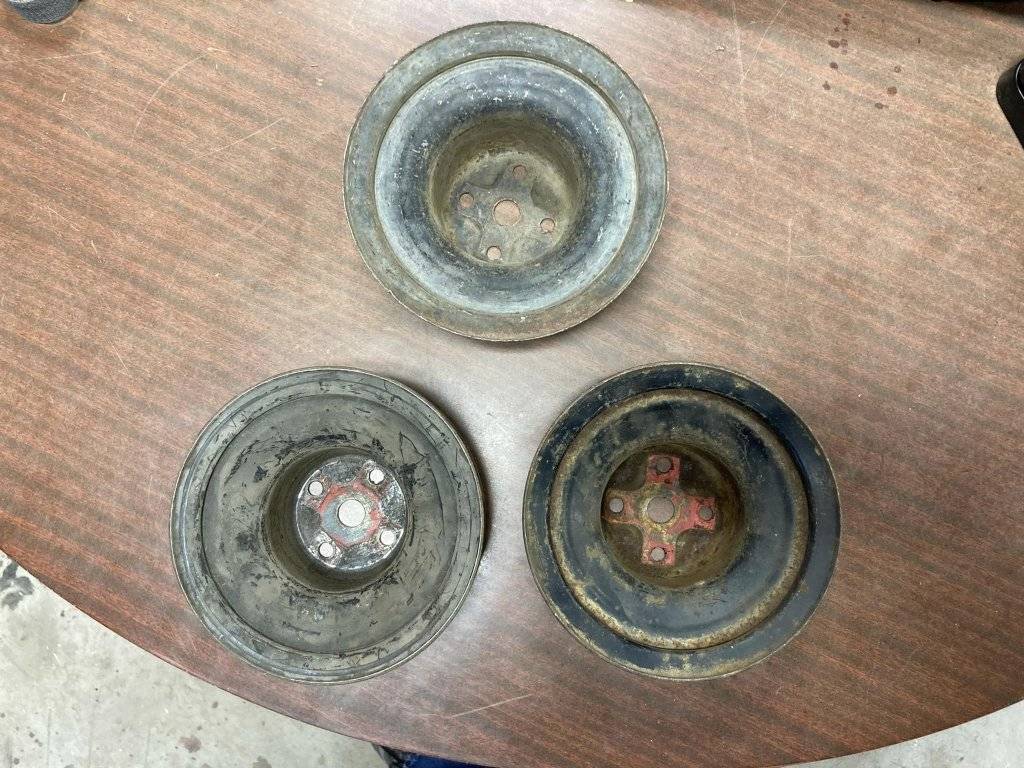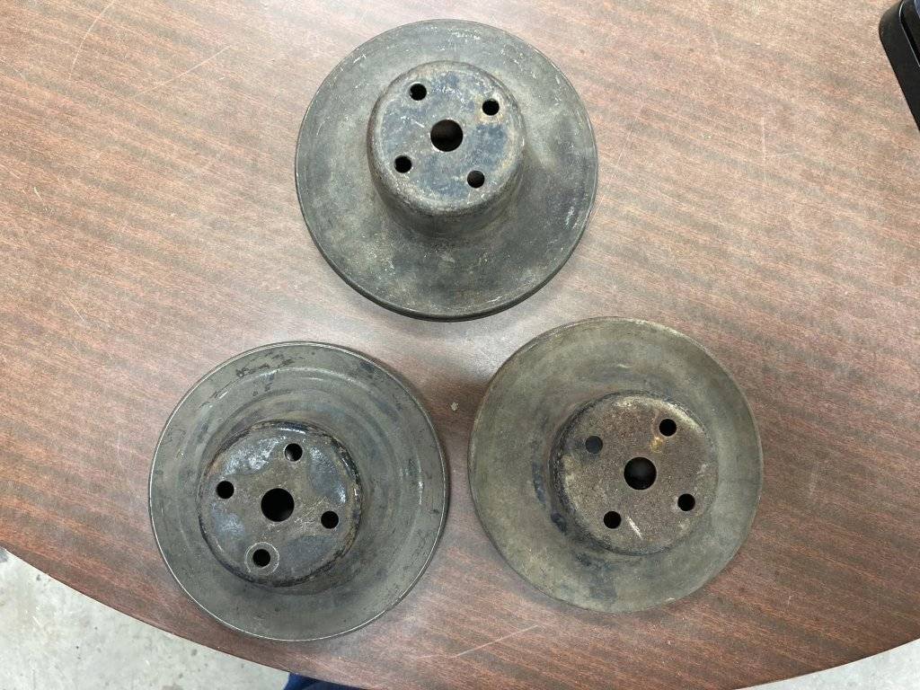 Bottom 2 pulleys are single groove water pump pulleys are 6 1/2"and 2 3/4" deep - 1 SOLD, 1 still available