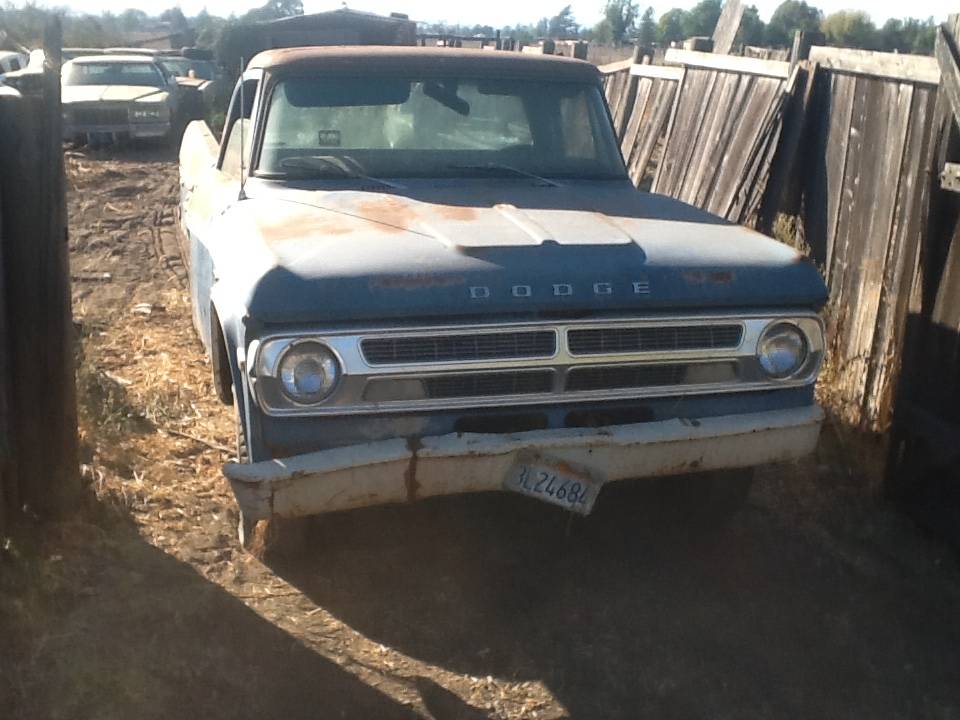 here it is at my shop , 71 d200 camper special was 383 auto ps pb air , this truck can fix orangey , or orangey can turn this d200 into a short d100 . lol ! oh ya knote that tunk in the bed of the blue boy , that a real car tunk from the 30's maybe 20's . its weight duty all metal .