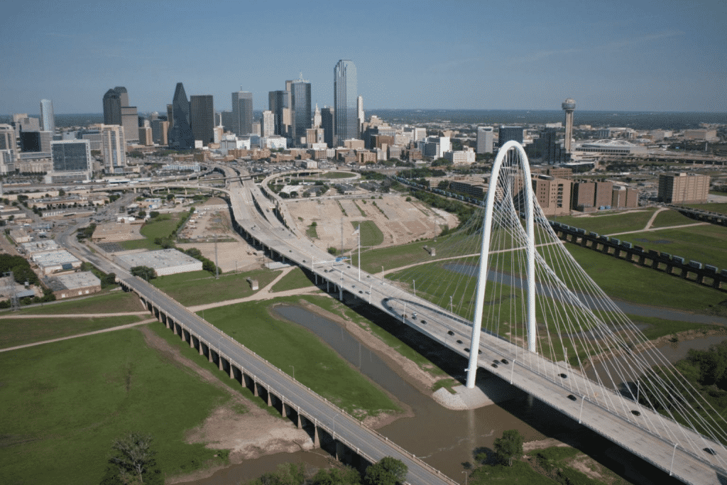 Hill bridge, finished 2012, looking south easterly toward downtown Dallas, Reunion Tower in the distance