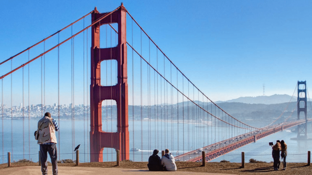 One of the world's most recognizable structures in the background. The Golden_Gate_Bridge, opened in 1937, it was and still is an engineering marvel, given its size and topography of the area.