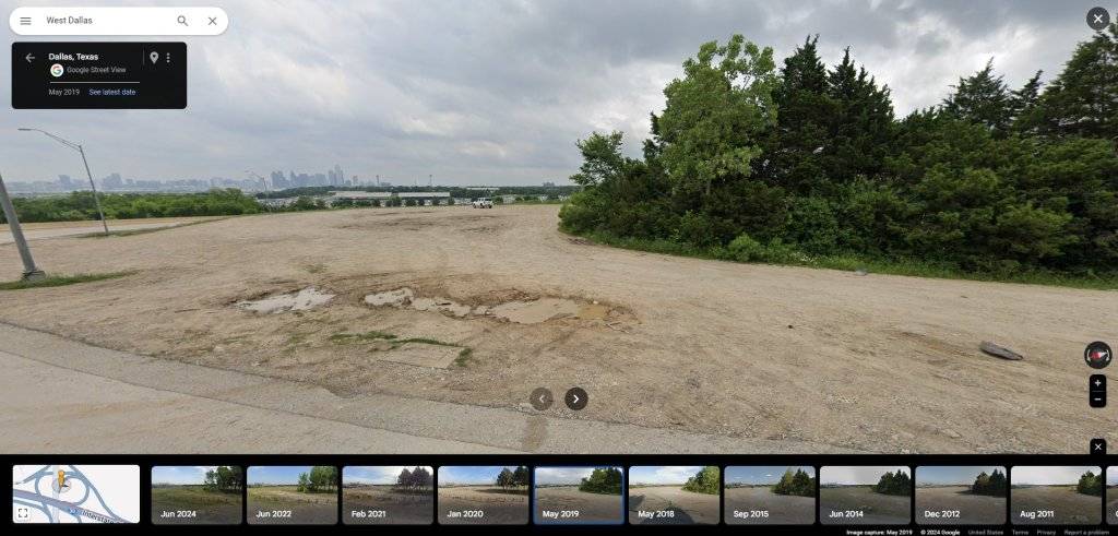 The city skyline is in the background, and it appears the Nissan was parked just off north side of I-30 at Hamption Rd, near/at an interchange that overlooks the Dallas Police impound lot in the right lower foreground.