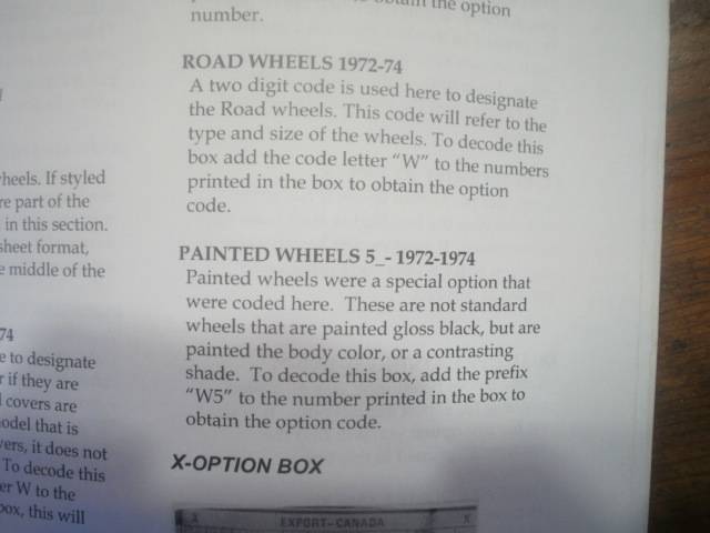 - Line 12 "WH/COV": "Covers or Delete" = 01 (no code 01 listed in the book for 1969-1974, "Road Wheels" = 93 (no code 93 listed in the book for 1972).
