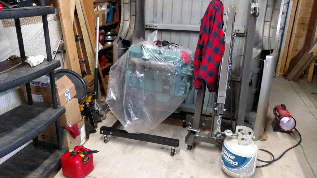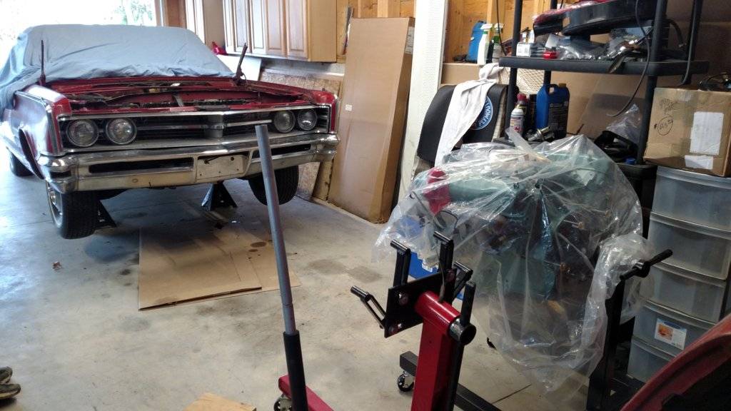 I look at the garage space big enough to use the cherry picker indoors and all I can think is I hate you...Starting to make a little progress with the engine transplant for the '66 convertible. The patient is ready: